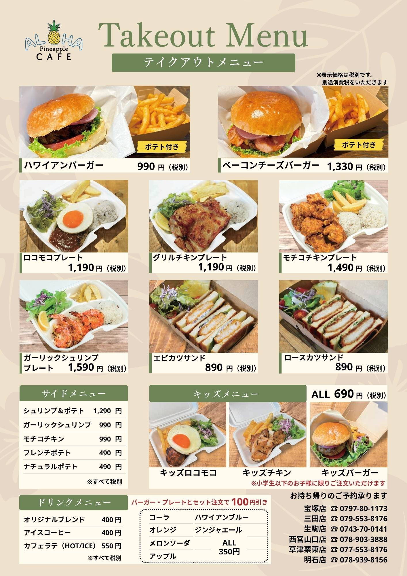 テイクアウトメニュー ※一部店舗のみ テイクアウトメニューは宝塚店、西宮山口店、三田店、生駒店、草津栗東店、明石店のみとなります。梅田茶屋町店、みのお船場店、ベイサイドビーチ坂店はメニューが異なりますのでご注意ください。 梅田茶屋町店メニュー みのお船場店メニュー ベイサイドビーチ坂店メニュー